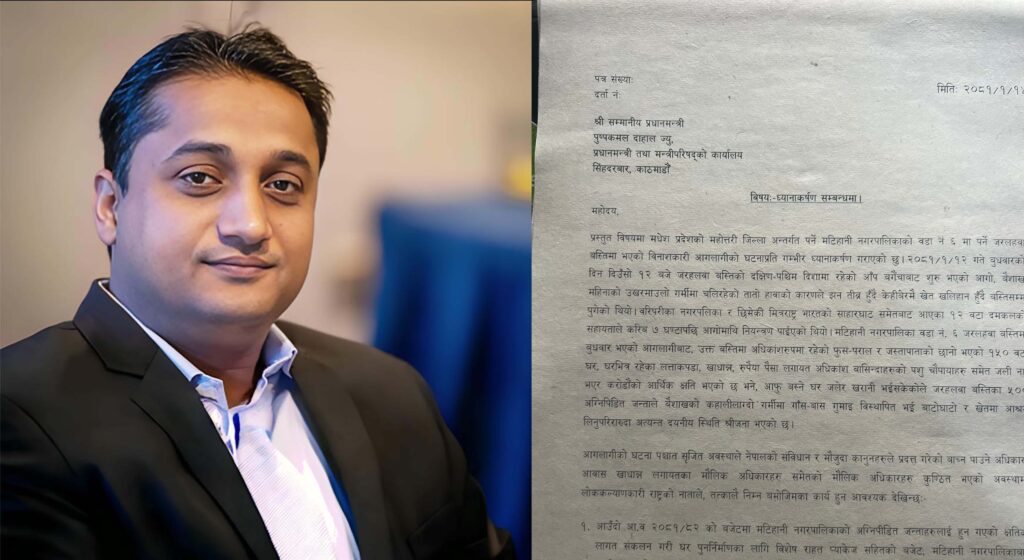 मटिहानी आगलागी : पूर्वमुख्यन्यायाधिवक्ता झाद्वारा प्रधानमन्त्रीसमक्ष ध्यानाकर्षण पत्र