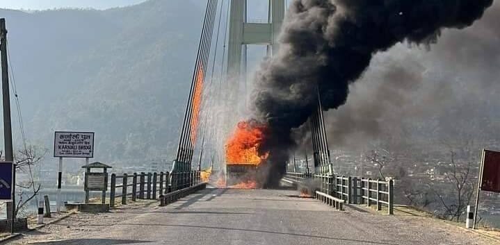 कर्णाली पुलमाथि गुडिरहेको ट्रकमा आगलागी