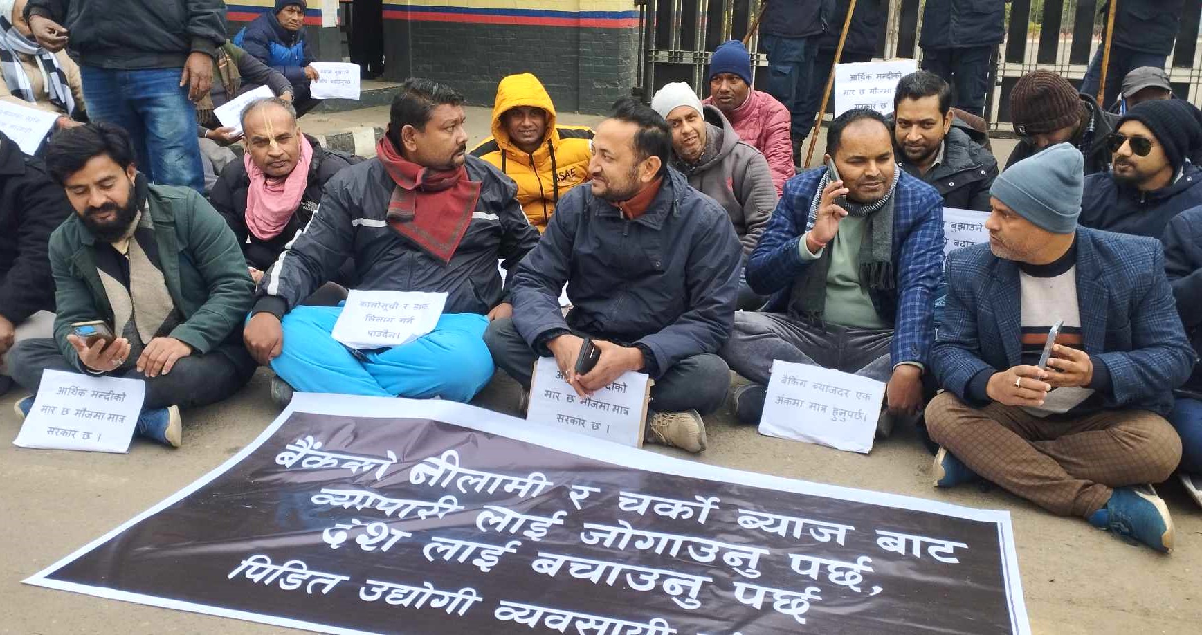 बैंकको चर्को ब्याजविरुद्ध जनकपुरधामस्थित जनक चोकबाट उद्योगी व्यवसायी पीडित संघर्ष समितिले निकालेको र्याली राष्ट्र बैंक अगाडि पुगेर धर्नामा परिणत भएको थियो ।