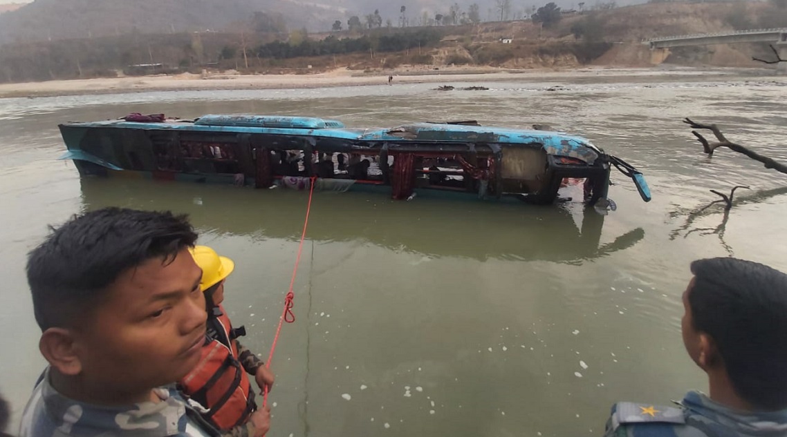 कपिलवस्तुबाट काठमाडौं जाँदै गरेको यात्रुबाहक बस त्रिशूली नदीमा खस्दा ६ जनाको मृत्यु भएको छ । प्रहरीले ३७ जनाको प्रहरीले जिवितै उद्धार गरेको छ ।
