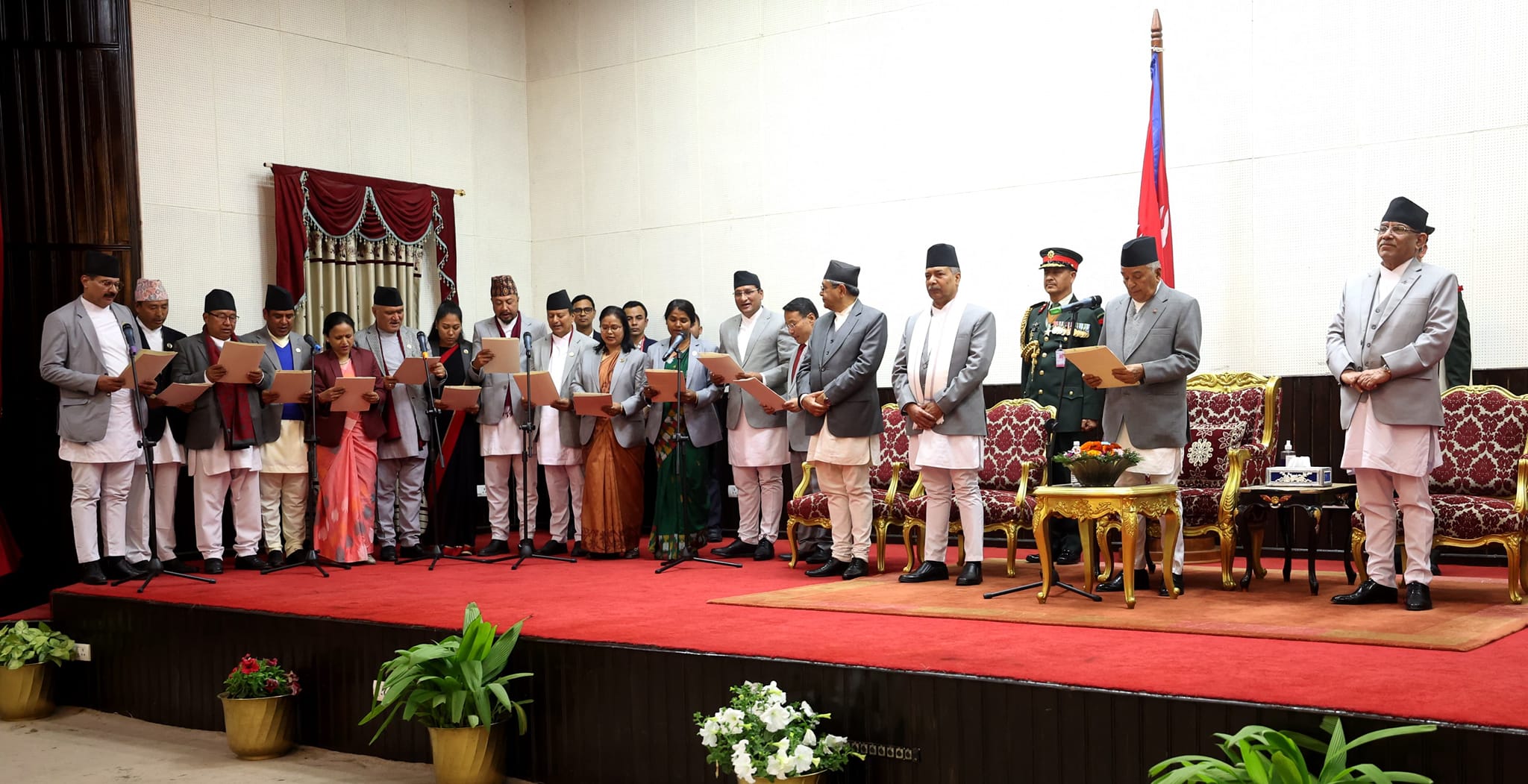 काठमाडौँ, २३ फागुन । प्रचण्ड सरकारमा नवनियुक्त १६ मन्त्रीले पद तथा गोपनीयताको शपथ लिएका छन् । बुधबार साँझ राष्ट्रपति भवन शीतल निवासमा भएको समारोहका राष्ट्रपति रामचन्द्र पौडेलले मन्त्रीहरूलाई पद तथा गोपनीयताको शपथ दिलाएका हुन् ।