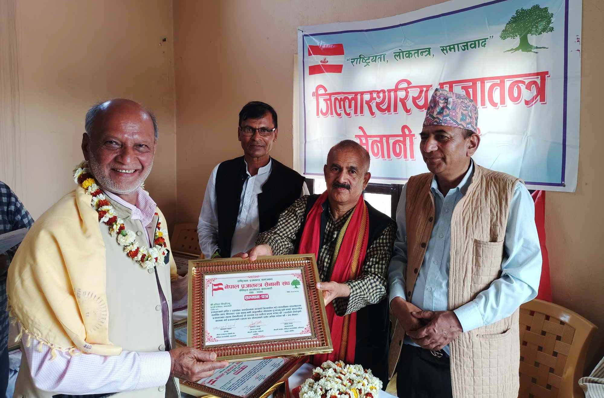 जलेश्वर स्थित नेपाली काग्रेसको पार्टी कार्यालयमा आयोजित कार्यक्रममा नेपाली काँग्रेसका सहमहामन्त्री महेन्द्र यादवले प्रजातन्त्र प्राप्तिकालागि योगदान दिएका योद्धाहरुलाई सम्मान गरेका हुन् ।