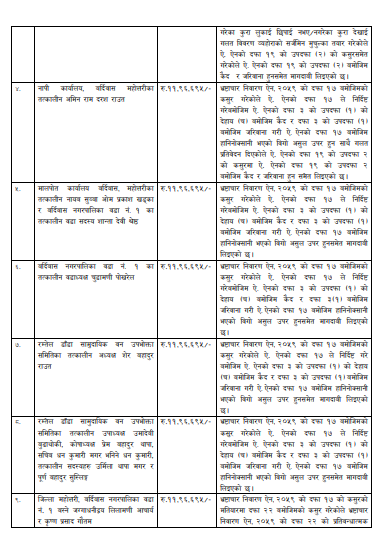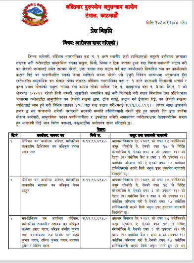 त्यस्तै नापी कार्यालय महोत्तरीका तत्कालीन अमिन रामदरश राउत, मालपोत कार्यालयका तत्कालीन नायव सुब्बा ओमप्रकाश खड्का र बर्दिबास नगरपालिका वडा नं. १ का तत्कालीन वडा सदस्य शान्ता देवी श्रेष्ठ, बर्दिबास नगरपालिका वडा नं. १ का तत्कालीन वडाध्यक्ष चुडामणी पोखरेल र रम्तेल डाँडा सामुदायिक वन उपभोक्ता समितिका तत्कालीन अध्यक्ष शेरबहादुर राउतविरुद्धसमेत अख्तियारले मुद्दा दायर गरेको छ । उनीहरूविरूद्ध ११ लाख ९६ हजार ६९५ रुपैयाँ विगो माग दाबी गरिएको छ ।