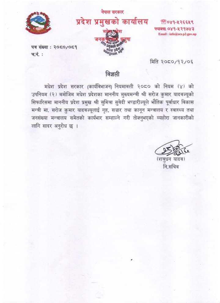 जनकपुरधाम, ६ चैत्र । मधेश प्रदेश सरकारका नवनियुक्त भौतिक पूर्वाधार विकासमन्त्री सरोजकुमार यादवलाई थप दुई मन्त्रालयको जिम्मेवारी दिइएको छ ।