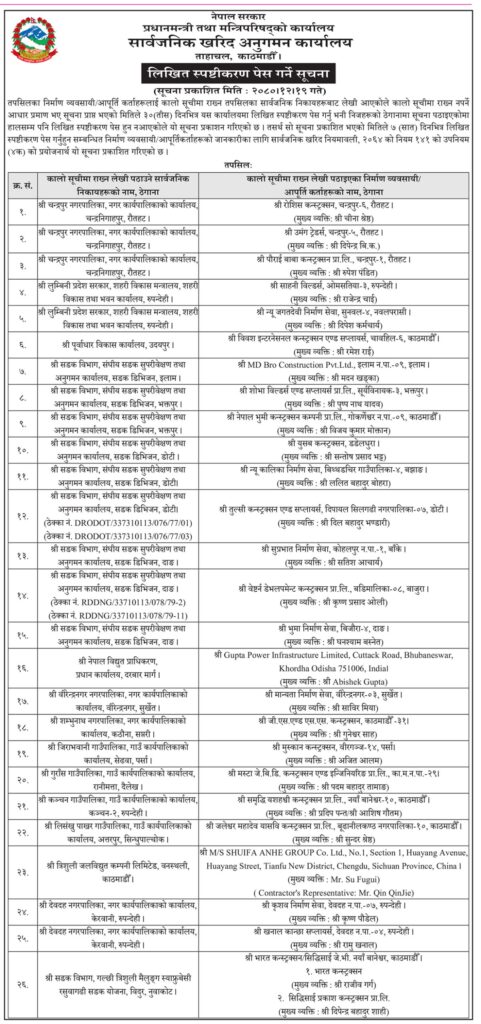 कार्यालयले २७ वटा कम्पनीलाई कालोसूचीमा राख्न लागेको हो । यी कम्पनीलाई विभिन्न सार्वजनिक निकायबाट आएको सिफारिसका आधारमा कालोसूचीमा राख्ने संस्थाले सूचना जारी गर्दै जनाएको हो । यस्तै, कार्यालयले कालोसूचीमा राख्नु नपर्ने कारण भए ७ दिनभित्र स्पष्टीकरण पेश गर्न भनेको छ ।