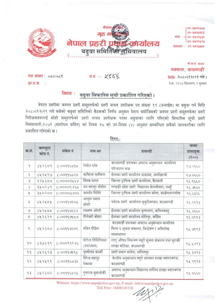 प्रहरी प्रधान कार्यालयको बुधबार बसेक बढुवा समितिको बैठकले जनपद प्रहरी समूहतर्फका १९ जना इन्स्पेक्टरलाई डिएसपीमा बढुवा गर्न सिफारिस गरेको हो।
