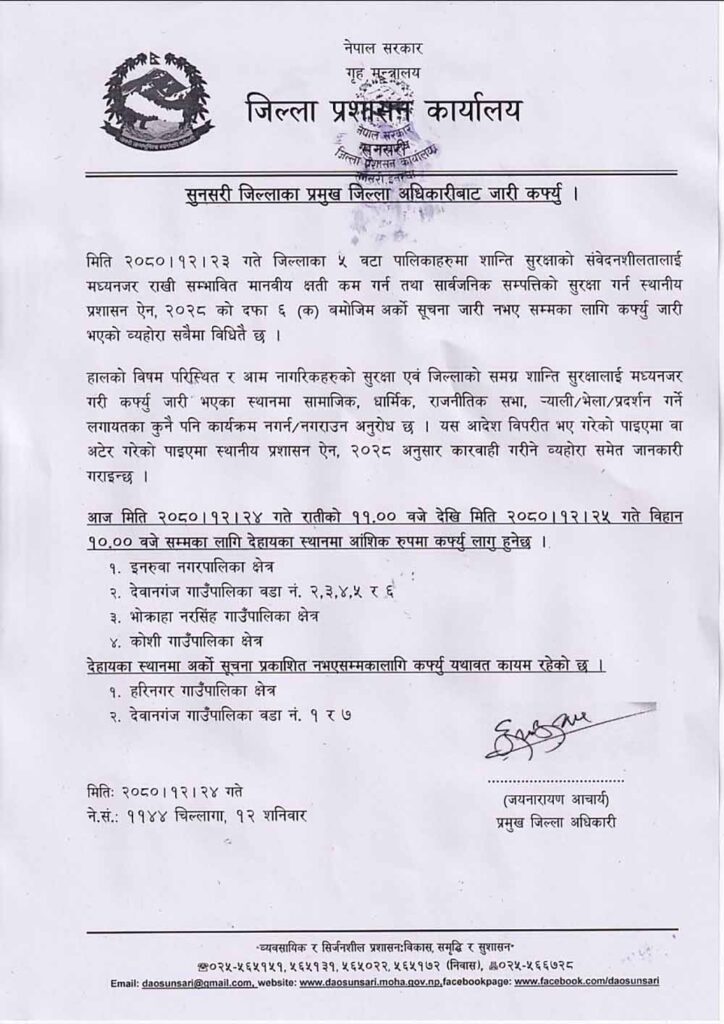 साथै अर्को सूचना जारी नभएसम्मका लागि जिल्लाको समग्र शान्ति सुरक्षालाई मध्यनजर गरी कर्फ्यु जारी भएका स्थानमा सामाजिक, धार्मिक, राजनीतिक सभा, र्याली /भेला/प्रदर्शन नगर्न/नगराउन पनि भनिएको छ ।