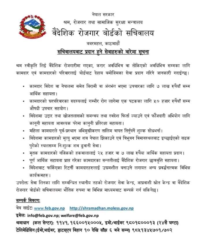 त्यस्तै, मृतक कामदारको नजिकको हकवालालाई २५ हजार वा ७ लाख रूपैयाँ आर्थिक सहायता दिने गरिएको छ । त्यसैगरी, पूर्ण आर्थिक सहायता प्राप्त गरेका कामदारका सन्तानलाई वैदेशिक रोजगार छात्रवृत्ति सहायता, विदेशबाट फर्किएका रिटर्नी कामदारहरूलाई उद्यमशील बनाउनेलगायत अन्य प्रबर्द्धनात्मक विभिन्न कार्यक्रमहरू पनि बोर्डले गर्दै आएको छ । यी सेवाहरू लिनका लागि सम्बन्धित स्थानीय तहको रोजगार सेवा केन्द्र, आप्रवाशी स्रोत केन्द्र वा वैदेशिक रोजगार बोर्डको सचिवालयमा सम्पर्क गर्न भनिएको छ ।