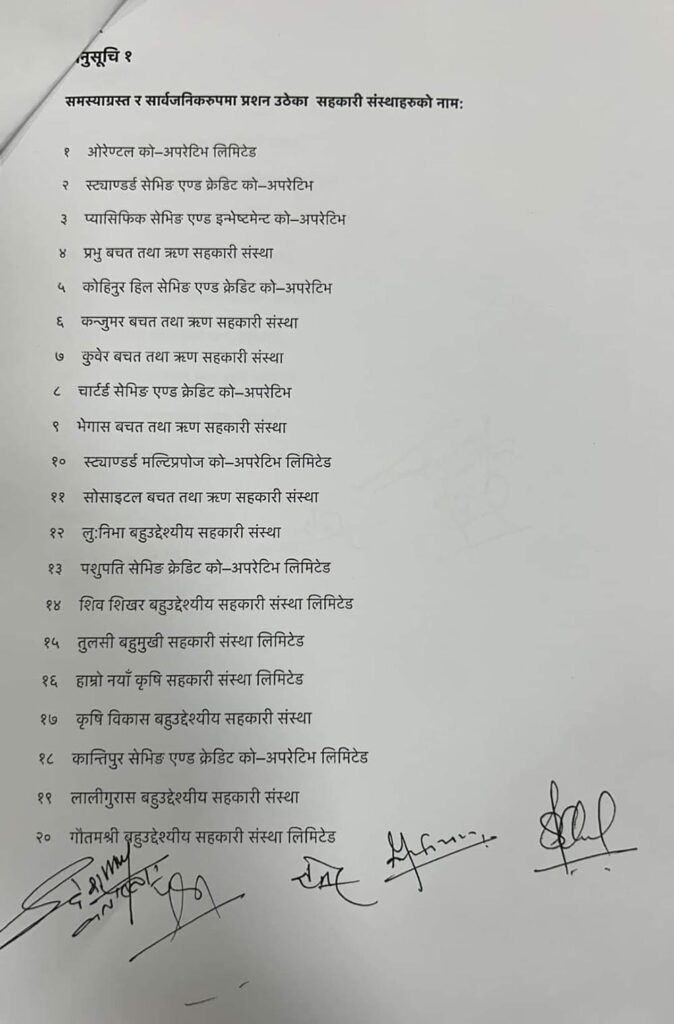 ३. नेपाल सरकार सहकारी विभाग र समस्याग्रस्त सहकारी व्यवस्थापन समितिले सार्वजनिकीकरण गरेका अनुसूची-१ मा उल्लेख भएका संस्थाहरू लगायतका सहकारी संस्थामा देखिएका समस्या समाधानको प्रयास र ती सहकारीमा आबद्ध बचतकर्ताको बचत सुरक्षा र फिर्ता को प्रक्रिया कहाँ पुगेको छ सो को अध्ययन विश्लेषण गरी अविलम्ब बचत फिर्ताको उपायसहितको सुझाव दिने ।