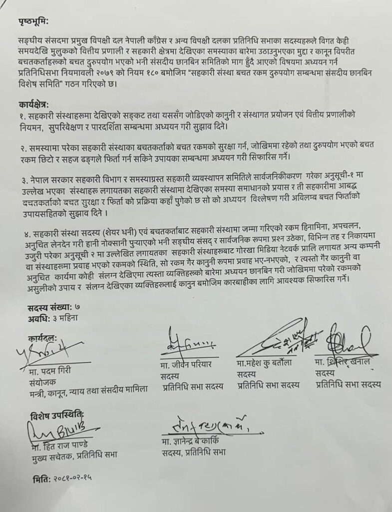 सङ्घीय संसदमा प्रमुख विपक्षी दल नेपाली काँग्रेस र अन्य विपक्षी दलका प्रतिनिधि सभाका सदस्यहरूले विगत केही समयदेखि मुलुकको वित्तीय प्रणाली र सहकारी क्षेत्रमा देखिएका समस्याका बारेमा उठाउनुभएका मुद्दा र कानून विपरीत बचतकर्ताहरूको बचत दुरुपयोग भएको भनी संसदीय छानबिन समितिको माग हुँदै आएको विषयमा अध्ययन गर्न प्रतिनिधिसभा नियमावली २०७९ को नियम १८० बमोजिम ‘सहकारी संस्था बचत रकम दुरुपयोग सम्बन्धमा संसदीय छानबिन विशेष समिति’ गठन गरिएको छ।