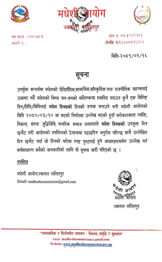 मधेशको ऐतिहासिक, सामाजिक, सांस्कृतिक तथा राजनीतिक महत्त्वलाई उजागर गर्दै मधेशको विषय जन मस्तिष्कमा स्थापित गराउन कुनै एक विशिष्ट दिन वा मितिलाई मधेश दिवसको रूपमा मनाउने आयोगले निर्णय गरेको थियो । सोही निर्णय कार्यान्वयनका लागि सूचना जारी गरिएको हो ।
