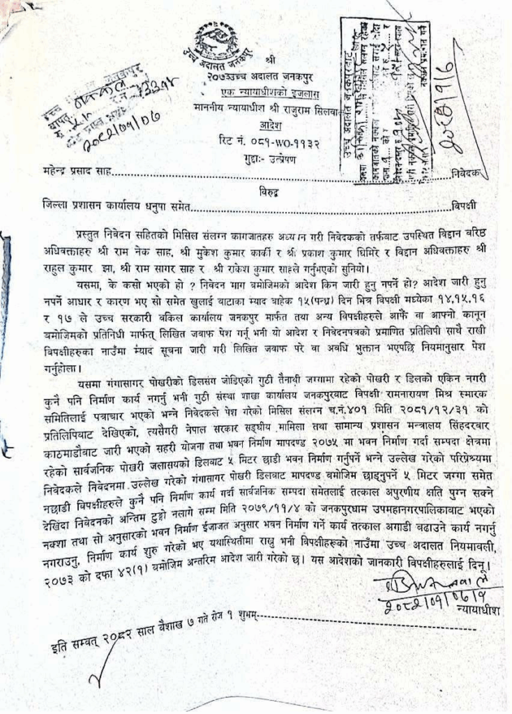 जनकपुरधाम उपमहानगरपालिकाले २०७९ फागुन ४ मा स्वीकृत गरेको नक्साको आधारमा भइरहेको निर्माण कार्यले सार्वजनिक सम्पदामा अपूरणीय क्षति पुर्याउन सक्ने देखिएकाले तत्काल निर्माण कार्य रोक्न भनिएको हो ।