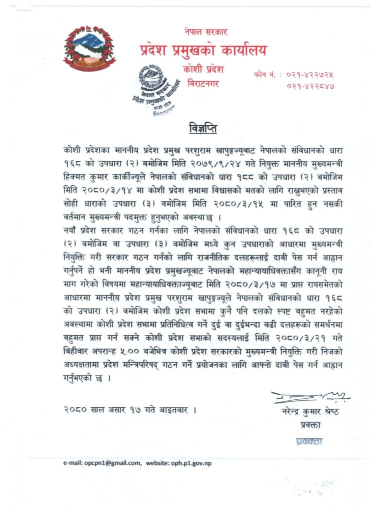 प्रदेश प्रमुख खापुङले संविधानको धारा १६८ (२) अनुसार दुई वा दुईभन्दा बढी दलको समर्थनमा सरकार गठनका लागि आह्वान गरेका हुन् । यसका लागि दलहरूलाई ५ दिनको समय दिइएको छ ।