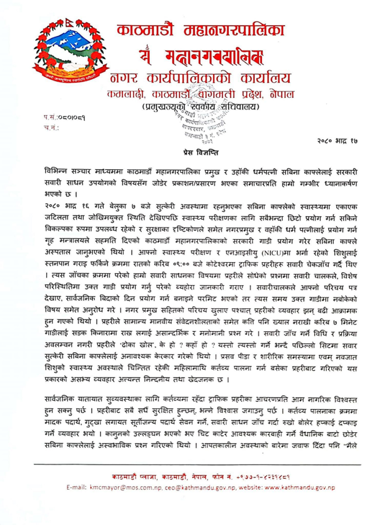मेयर बालेनको निजी सचिवालयले सुत्केरी अवस्थामा रहेकी मेयर पत्नी सविना काफ्लेमाथि प्रहरीले चेकजाँचका नाममा अनावश्यक केरकार गरिएको बताएको छ ।