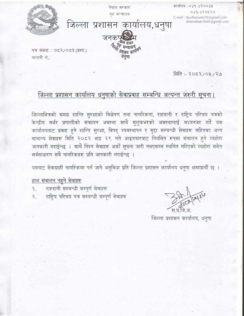 जिल्ला प्रशासन कार्यालय धनुषाले आइतबारदेखि अधिकांश सेवा पुनः सुरु गर्ने भएको छ। शुक्रबार सार्वजनिक गरिएको सूचनामा राहदानी र राष्ट्रिय परिचयपत्रसम्बन्धी सेवाबाहेक अन्य सबै सेवा सञ्चालनमा आउने जनाइएको छ।