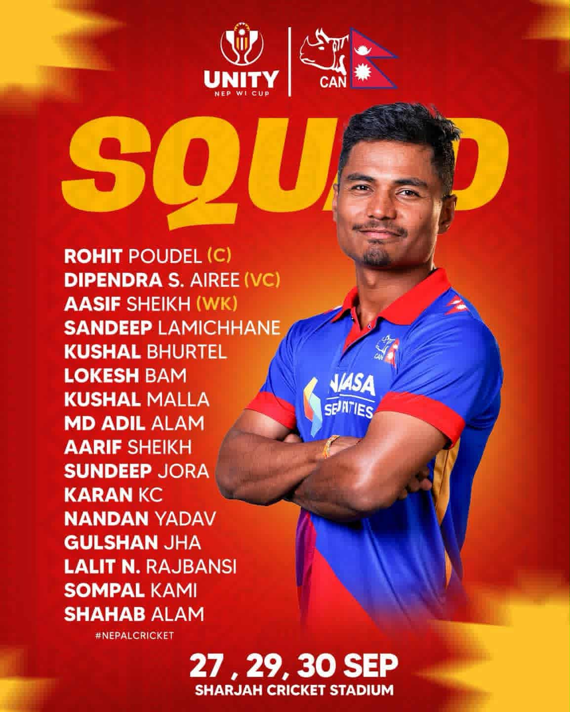 सोमबार नेपाल क्रिकेट संघ (क्यान)ले वेष्ट इन्डिजसँग खेल्ने नेपाली टिमको नाम सार्वजनिक गरेको हो। नेपाल टिमको स्क्वाडमा निलम्बन फुकुवापछि मो. आदिल आलम फर्केका हुन् ।