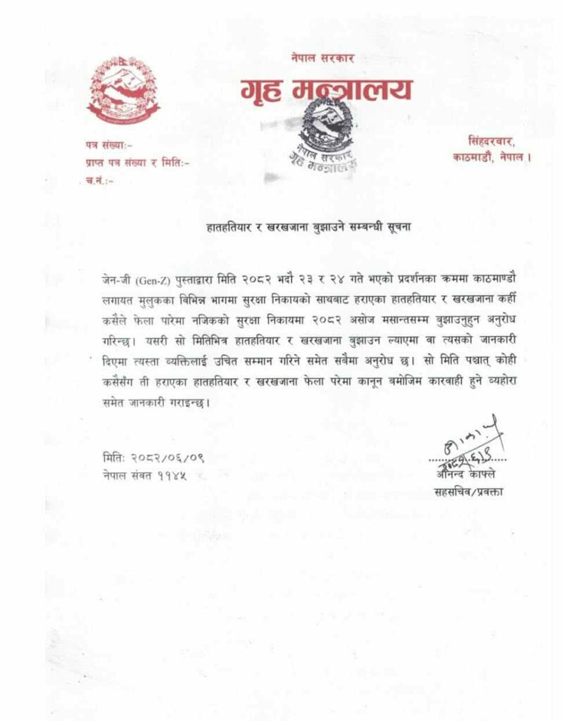 गृह मन्त्रालयले जेनजी प्रदर्शनका क्रममा काठमाडौंलगायतका मुलुकका विभिन्न भागमा सुरक्षा निकायको साथबाट हराएका हतियार बुझाउन आग्रह गरेको छ ।