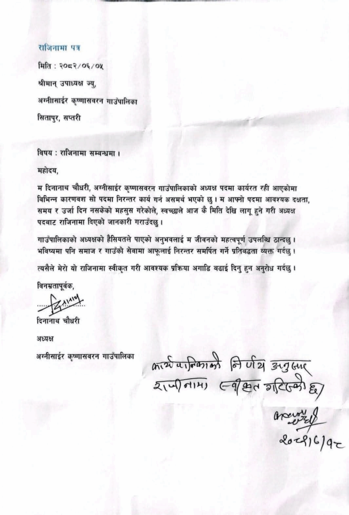 असोज ५ गते मितिको पालिका अध्यक्ष चौधरी राजिनामा पत्र बुझाएको भन्दै कार्तिक १८ गते कार्यपालिका बैठकले स्वीकृत गरेको छ । उपाध्यक्ष कल्पना चौधरी र वडा नं. १ का वडाध्यक्ष सबजुल खलिफाले पलिका अध्यक्षले राजिनामा दिएको पुष्टि गरे । तर पालिका अध्यक्ष चौधरीले विज्ञप्ति जारी गर्दै राजीनामा नदिएको दावी गर्दै पूर्ण रूपमा किर्ते र नियोजित भ्रम फैलाउने काम भएको आरोप लगाएका छन् ।