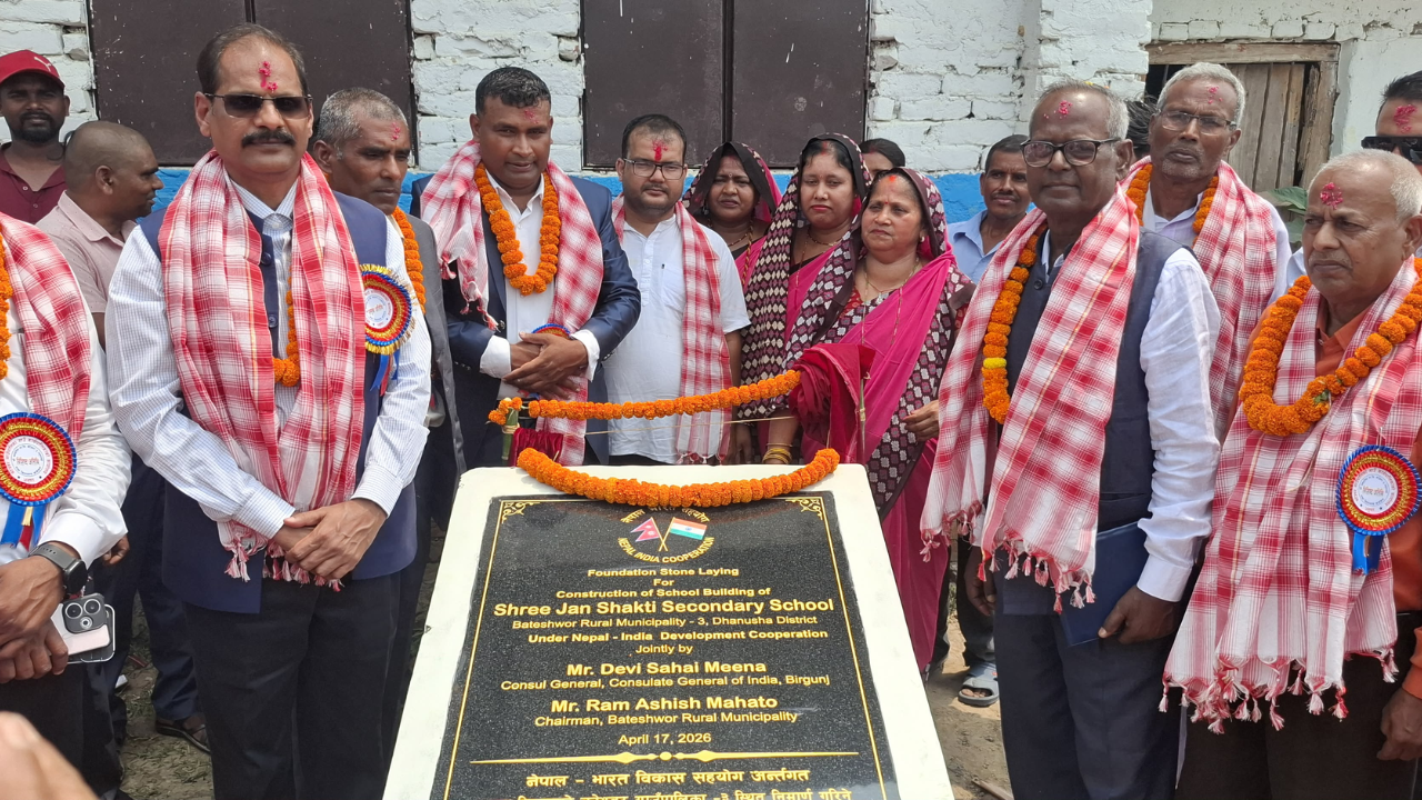 धनुषाको बटेश्वर गाउँपालिका-३ स्थित जनशक्ति माध्यमिक विद्यालयमा भारत सरकारको आर्थिक सहयोगमा नयाँ भवन निर्माण कार्य सुरु भएको छ । भवन निर्माण योजनाको शुक्रबार एक कार्यक्रमबीच भारतको महावाणिज्य दूतावास, वीरगञ्जका महावाणिज्य दूत देव सहाय मीना र बटेश्वर गाउँपालिकाका अध्यक्ष रामअशिष महतोले संयुक्त रूपमा शिलान्यास गरे ।