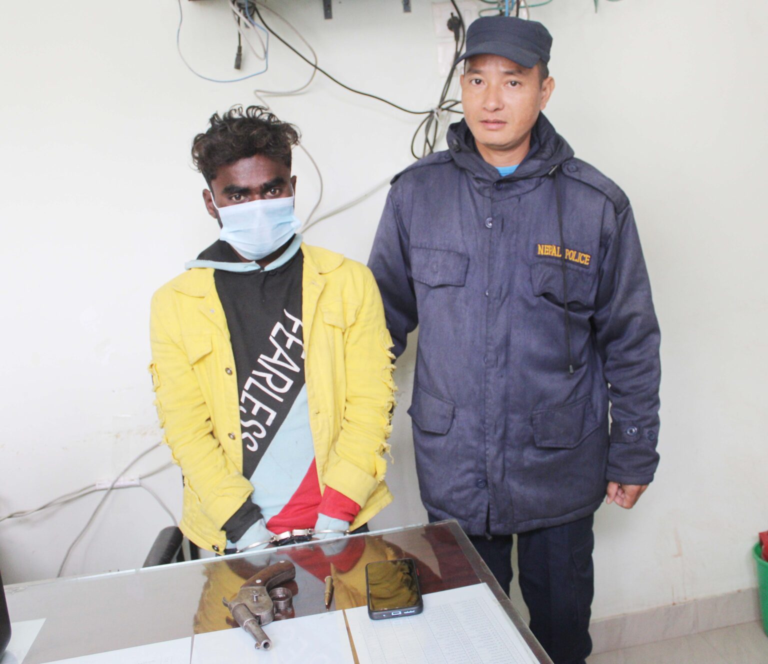 २९ मङ्सिर, जनकपुरधाम । सिरहमे प्रहरीद्वारा एक गोटे युवकके कटुवा पेस्तोलसहित नियन्त्रणमे लेने अछि। ईलाका प्रहरी कार्यालय बिष्णुपुर सिरहासं खटल प्रहरीके गस्ती टोली बिष्णुपुर गाँउपालिका ३ राजपुर के बासिन्दा २२ वर्षीय विन्दे कहेबाला सावनकुमार दासके शंकाके आधार प् चेकजाँच करेक समय मे कटुवा पेस्तोल बरामद कइने छल जिल्ला प्रहरी कार्यालय सिरहाद्वारा बतौलिन।